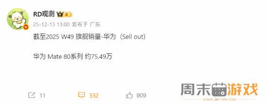 华为份额重回中国第一!Mate 80系列销量达75.49万快科技12月13日消息,据博主“RD观测”透露,截至2025 W49,华为Mate 80系列的销量约75 49万。这个成绩已经大幅超越了国内多家厂商的旗舰机型,仅次于小米17系列,与REDMI K90