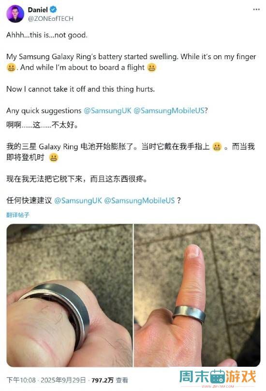 三星智能戒指状况百出 这边电池鼓包卡手 那边续航崩9 月 30 日消息,YouTube 频道 ZONEofTECH 主播 Daniel Rotar 今天(9 月 30 日)在 X平台发布推文,反馈称其在登机前所佩戴的三星 Galaxy Rin