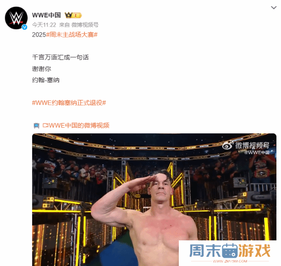 WWE赵喜娜退役!认输剧本引粉丝怒批:太恶心12月14日,据微博@WWE中国消息,WWE选手“赵喜娜”约翰·塞纳于今日正式退役。然而,塞纳的最后一场比赛因认输剧情而备受争议,粉丝看后纷纷吐槽:“真是太过恶心。”在@WWE中国放出的视频中,约翰·