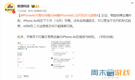 iPhone Air开售日爆料:合约机形式绑定 eSIM不能切换根据微博@新浪科技的消息称,近日有数码博主爆料称,iPhone Air将在下个月(10月)开售,没有全网通版本,并以营业厅合约机形式销售,eSIM在三大运营商之间不能随意切换。此外,苹果并不打