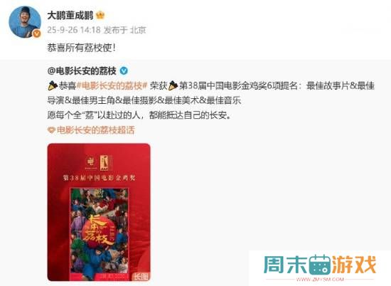 电影《长安的荔枝》获金鸡奖6项提名 大鹏:恭喜所有荔枝使电影《长安的荔枝》荣获第38届中国电影金鸡奖6项提名:最佳故事片、最佳导演、最佳男主角、最佳摄影、最佳美术、最佳音乐。9月26日,大鹏回应提名金鸡奖:“恭喜所有荔枝使!”据悉,大鹏凭借电影《长安的荔