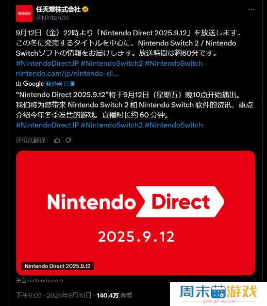 来了!最新一期任天堂直面会定档9月12日!你期待看到哪些游戏?任天堂正式官宣,新一期任天堂直面会将于9月12日晚9点召开!本次直面会时长大约为1小时,将重点介绍预计在今年冬季发售的游戏!虽然详细情报尚未公布,不过此前有爆料人透露,本次直面会可能会公布《银河战士P