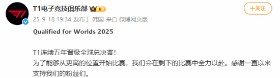 T1晋级S15后发文:连续五年晋级全球总决赛 全力以赴T1 3-1战胜DK,拿到最后一张晋级S15的门票!刚刚,T1电子竞技俱乐部发文:“T1连续五年晋级全球总决赛!为了能够从更高的位置开始比赛,我们会在剩下的比赛中全力以赴。感谢一直以来支持我们的粉丝们