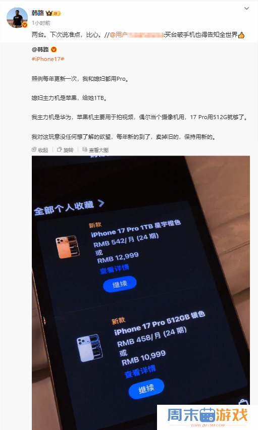 网友嘲讽韩路买iPhone 17 Pro还发微博 本人:我买两台快科技9月11日消息,昨日凌晨,苹果秋季发布会公布价格后,韩路便发微博,收藏了两台iPhone 17 Pro。图片显示,其中一台为iPhone 17 Pro 1TB星宇橙色、另一台为512GB