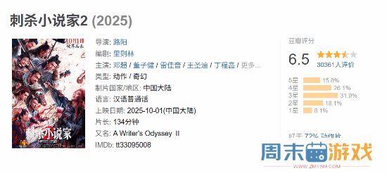 《刺杀小说家2》豆瓣评分6.5 观众:有些无聊近日,国产动作奇幻电影《刺杀小说家2》豆瓣评分出炉,截止发稿前,豆瓣评分6 5分。15 8%的观众给出了五星,26 1%的观众给出四星,31 9%的观众给出三星,18 1%的观众给出二星,8 1%的观