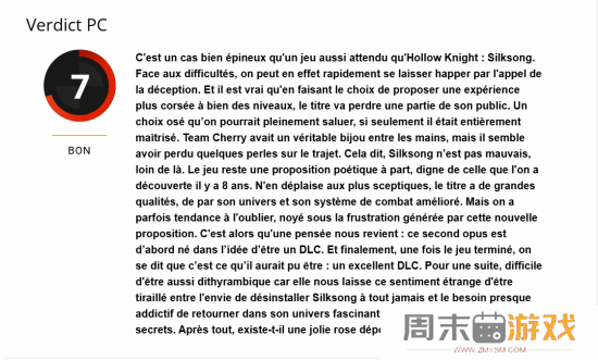 《空洞骑士:丝之歌》M站首个中评来了!本可以是个出色的DLC《空洞骑士:丝之歌》的M站收录媒体评分中,迎来了首个中评,gamekult为本作打出了7分的评价。总评:像《空洞骑士:丝之歌》这样备受期待的游戏,确实是一个非常棘手的案例。面对困难,人们很容易被失望的
