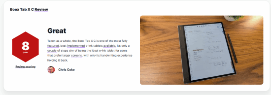 IGN评BooxTabXC墨水屏给出8分评价:接近理想近日知名外媒IGN评测了Boox Tab X C墨水屏,并给出8分评价,简评称,该墨水屏是目前功能最全面的墨水屏之一,并且该墨水屏对于大屏用户来说几乎是理想选择,手写体验稍微拖了后腿。IGN总