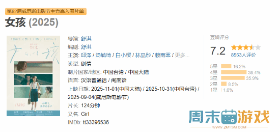 舒淇导演处女作《女孩》豆瓣7.2分!双女主演绎女性命运舒淇导演的首部电影作品《女孩》豆瓣现已开分,获得了7 2的高分,目前该影片正在热映中! 影片介绍:1988年,基隆港烟尘蔽日,林小丽(白小樱 饰)在迷惘中长大,渴望逃离黑暗。 直到遇见无惧眼光、