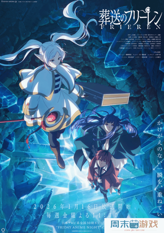 《葬送的芙莉莲》第二季视觉图公开!明年1月开播动画《葬送的芙莉莲》第二季最新视觉图公开,动画将于2026年1月16日开播。主视觉图描绘了芙莉莲与菲伦、战士修塔尔克一行人悬浮在布满水晶状物体的空间中的场景,呈现了第一季未曾出现过的新剧情。视觉图令人
