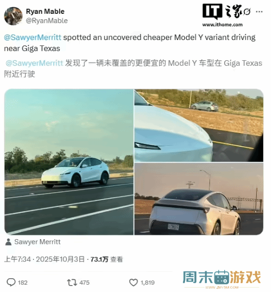 特斯拉“廉价版”车型无伪装谍照曝光!取消贯穿灯带IT之家10月3日消息,传闻已久的Model Y“廉价版”已经在特斯拉得州超级工厂下线并开启路测,官方定名为Model Y Standard。据谍照拍摄者介绍,拍摄地点位于得克萨斯州130号公
