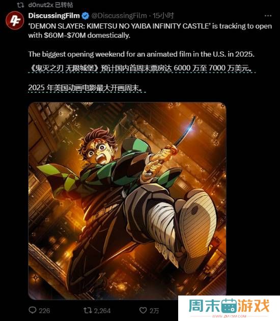 势如破竹 《鬼灭之刃:无限城篇》剑指欧美票房纪录!根据最新票房数据,《鬼灭之刃:无限城篇》正以破竹之势席卷国际影院,有望成为欧美市场最成功的日本动画电影之一。这部改编自吾峠呼世晴漫画最终章的电影,已在欧洲创下多项纪录,并显现出称霸的北美票房的迹象。在