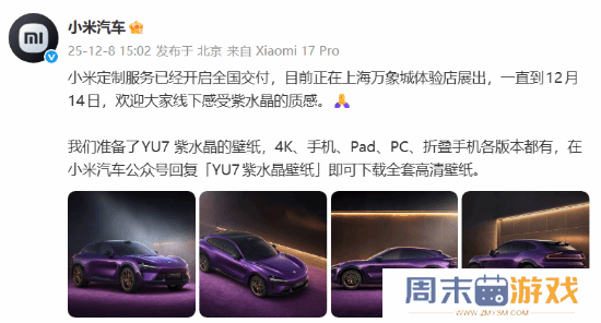 小米YU7紫水晶官方高清壁纸发布!手机、PC全都有今日,小米汽车官方发布YU7紫水晶全套高清壁纸,覆盖4K、手机、平板、PC、折叠手机。大家可以在小米汽车公众号回复“YU7紫水晶壁纸”免费下载。小米CEO雷军表示,紫水晶是一种很贵气的一种紫色,如镜面