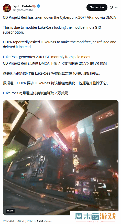 CDPR下架《赛博朋克2077》付费VR mod 引玩家群体热议近日,X账号Synth Potato发布消息称,CDPR已将mod制作者LukeRoss制作的《赛博朋克2077》的VR mod强制下架,理由是将其用于商业行为,违反了创作公约。同时,CDPR副总监J