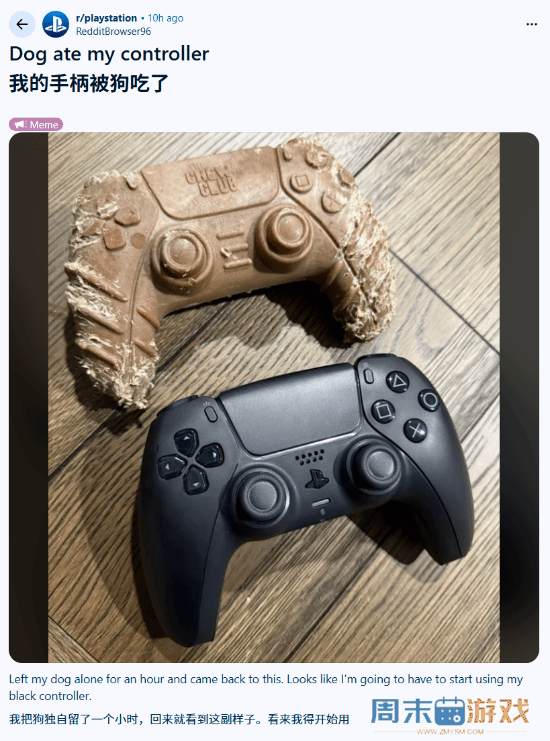 "PS5手柄"竟被狗啃了!网友:真是个馊主意!近日,在Reddit论坛,有玩家分享了PS5手柄被自己家狗狗撕咬后的惨照——不过还是只是手柄装的磨牙玩具。他调侃道:把狗独自留在家里一小时,回来发现这副惨状。看来我得开始用我的黑色手柄了。玩家们在评论