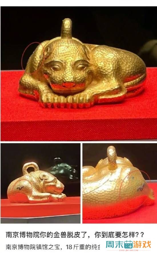 南博镇馆之宝金兽被指脱皮掉色 院方:属出土文物正常现象近日,多位网友发帖反映,南京博物院陈列的镇馆之宝之一西汉金兽,疑似出现“脱皮掉色”现象。网帖图片显示,金兽的右腿上方的确有一大块黑斑及小块的绿色斑点。25日,记者以游客身份致电南京博物院,一工作人员表