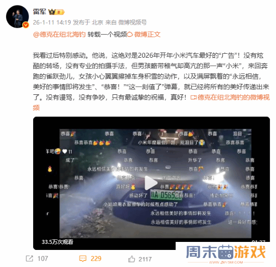 这是绝对2026年小米汽车最好的广告!雷军:我看过后特感动今日,雷军转发@德克在纽北海钓 分享的一段视频,直言“我看过后特别感动”。以下为微博原文:我看过后特别感动。他说,这绝对是2026年开年小米汽车最好的“广告”!没有炫酷的转场,没有专业的拍摄手法,但男