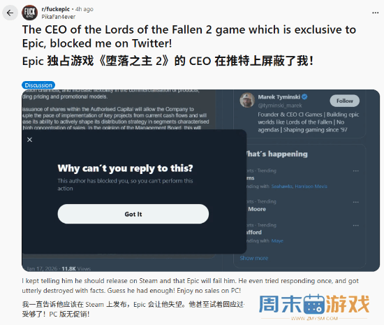 玩家屡次建议《堕落之主2》别搞独占 被CEO拉黑Reddit 用户 PikaFan4Ever 近日发帖称,因多次建议《堕落之主 2》开发商 CI Games 的 CEO Marek Tyminski 将游戏首发于 Steam(该作当前为 Epic