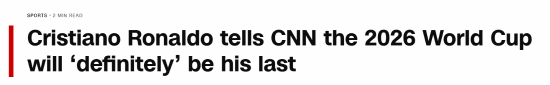 40岁C罗确认一两年内退役!明年世界杯最后一舞葡萄牙球星克里斯蒂亚诺·罗纳尔多·多斯·桑托斯·阿维罗接受CNN采访时表示,2026年世界杯将“绝对”是他职业生涯的最后一届。C罗接受CNN采访时表示:“到那时我已经41岁了,我认为那会是我最后一次参