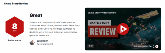 IGN8分!怪诞新游《Skate Story》今日发售 同步加入PS+游戏库《Skate Story》已于今日发售,IGN发布了本作的评测文章,并给出8分的成绩。简评称,本作扎实而令人满意的写实滑板技巧,与一个奇异抽象的世界相融合。它在其怪异特质下略显摇晃不稳,但毫无疑问,它