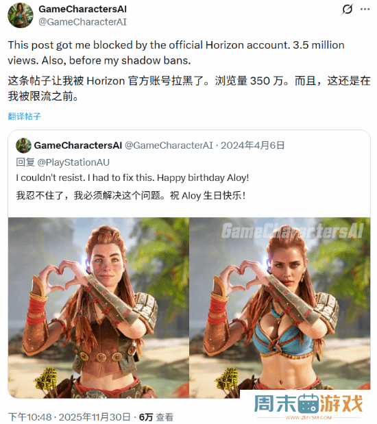 就这点气量?博主曾用AI爆改埃洛伊结果被官方拉黑自《地平线:西之绝境》发售以来,女主埃洛伊的颜值就饱受玩家们争议。国外博主@GameCharacterAI 在去年用AI重塑的埃洛伊美图,胸大腰细臀翘的样子引来不少好评。近日,博主本人转发了当年的帖子