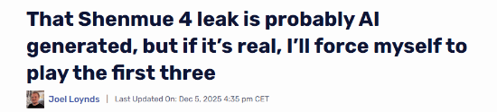 太劣质了!《莎木4》TGA泄露预告 外媒质疑是AI做的近日,Reddit社区有用户上传了一段据称为《莎木4》预告片的四分钟视频,随即引发玩家热议。然而,在OpenAI Sora 2等AI生成工具日益成熟的背景下,真实与虚构的边界正被不断模糊,许多玩家也质