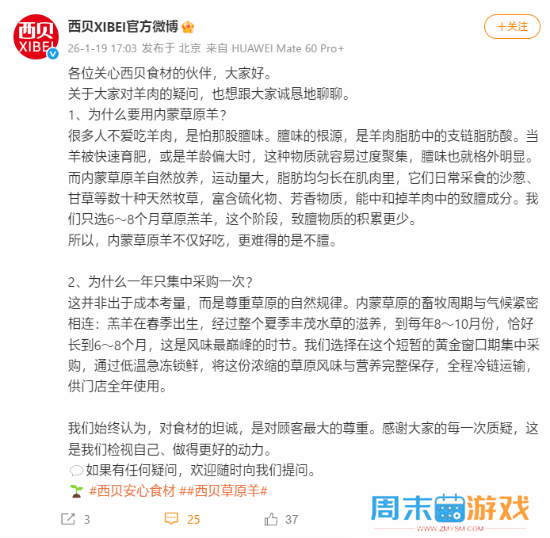 西贝回应羊肉1年集中采购1次:8-10月份是羔羊风味巅峰最近西贝因为创始人贾国龙的接连发声重获关注,在冷冻西兰花等问题之外,还首次正面回应了羊肉1年集中采购1次的话题。西贝表示,这并非出于成本考量,而是尊重草原的自然规律。内蒙草原的畜牧周期与气候紧密相连: