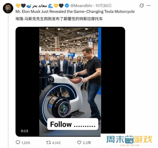 马斯克回应特斯拉不涉足摩托车:之前骑差点命丧黄泉12 月 1 日消息,X 平台用户 @Moandbhr 昨天发布了一段“马斯克骑单轮摩托车”的 AI 视频,并配文称“埃隆・马斯克先生刚发布了颠覆行业的特斯拉摩托车”,引发网友热议。而马斯克本人在今天