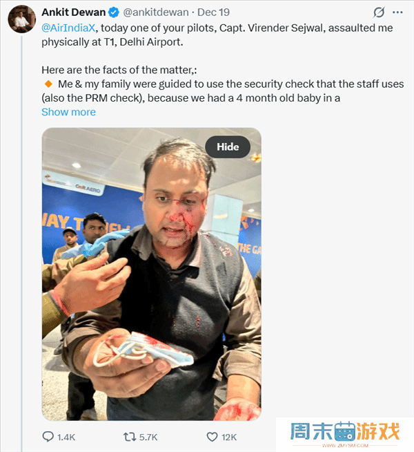 印度机长机场安检时插队 被抗议后竟挥拳殴打乘客12月23日消息,据印度媒体报道,一位名为德万的乘客,上周五在社交平台X上发布了一张自己脸上带血的照片。并发文称,一名休班的印度航空快线(AIX)飞行员,因为插队与他发生争执后,对他进行了身体攻击。德