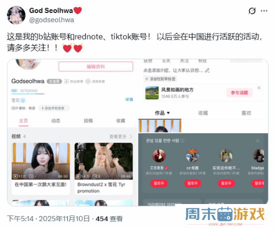 《剑星》体模尹雪花开通国内社交账号!向中国粉丝问好《剑星》体模尹雪花今日在推特上发布推文,表示自己已经开通了B站、小红书以及抖音的账号。“这是我的b站账号和rednote、tiktok账号! 以后会在中国进行活跃的活动,请多多关注!!”尹雪花本人还在