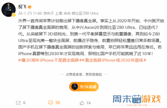 中兴总裁倪飞谈真全屏iPhone:国产手机早已将苹果远远甩在身后今日,话题“真全面屏iPhone或2030年登场”引发业内与网友热议。对此,中兴通讯终端事业部总裁、努比亚技术有限公司总裁倪飞发文回应称,外界一直传闻苹果计划推出屏下摄像真全面屏,但事实上,中兴早在2