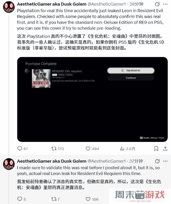 真的有里昂!《生化9》PS商店正式游戏封面泄露今日,我们曾报道过,知名爆料人AestheticGamer aka Dusk Golem发长文坚称《生化9》里昂将会登场并且是可操作角色。对于网络中充斥的许多怀疑,他本人言之凿凿,直言不明白为什么卡普
