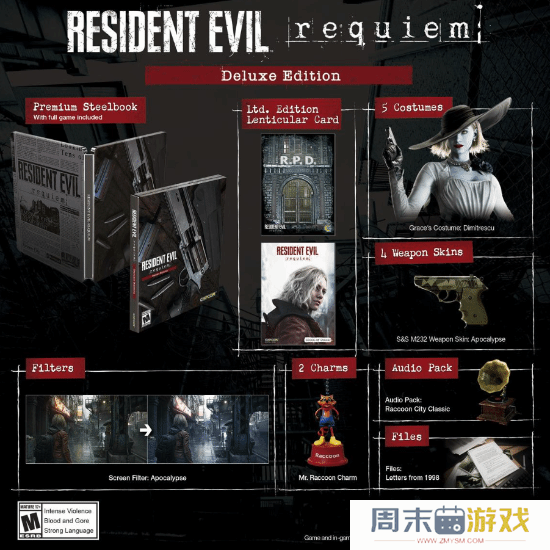 《生化9》豪华版新内容泄露!剧情DLC、还有萝丝玛丽近日,GameSpot官网售卖的《生化危机9:豪华版》详情页面疑似泄露了游戏更多豪华版内容,其中包含一些潜在剧透。游戏官方此前公布的豪华版内容包括:5套服装、2款滤镜、4款武器外观、2款挂件、音乐及音