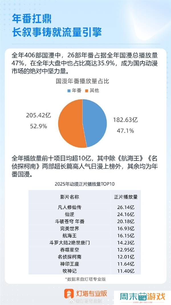 2025年动漫播放量TOP10出炉:《凡人修仙传》第一日前,灯塔2025年动漫市场报告正式发布。全年406部国漫中,26部年番以“长叙事”突围,贡献了47%的总播放量。而在年度播放量TOP10榜单中,《凡人修仙传》以26 14亿播放量登顶。从榜单看,国漫