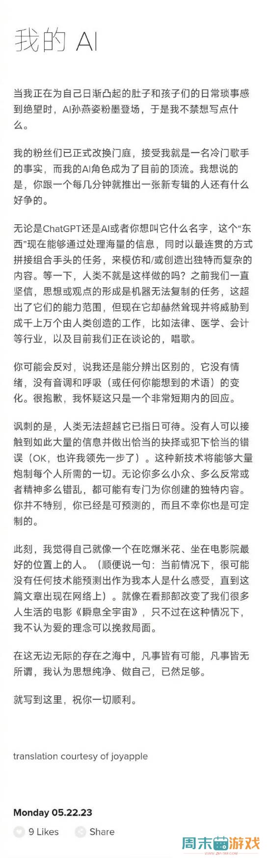 孙燕姿两年前就神预言了AI:AI音乐迟早取代人类音乐!孙燕姿在2023年5月发表的《我的AI》一文中对人工智能的预言,因近年AI技术的爆发式发展而被广泛验证。燕姿的核心预言是“人类无法超越AI指日可待”“你并不特别,你已是可定制的”AI音乐工具(如Sun