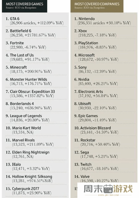 在2025年 任天堂一直是媒体讨论最多的游戏公司据相关数据源公布,2025年被媒体讨论最多的游戏和游戏公司分别是《GTA6》和任天堂,前者《GTA6》自不必多说,后者任天堂的讨论度也是因为今年NS2和一些NS2新游戏的推出。列表中显示,2025年提