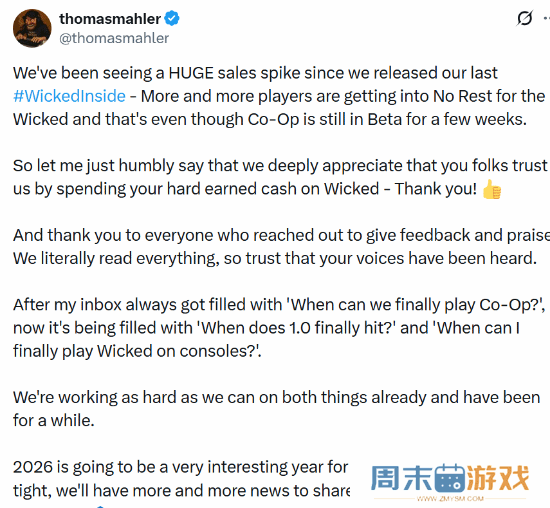 《恶意不息》新版本让销量大增:联机模式本月推出《恶意不息》创意总监thomas mahler发文,表示新版本上线后销量大增。合作模式仍处于测试阶段,还需要几周时间。“过去,我的收件箱总是被 我们到底什么时候才能玩到合作模式? 填满,而现在则变成了