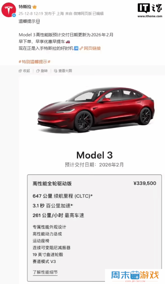 33.95万元 特斯拉Model 3高性能版预计交付日期更新为2026年2月IT之家 12 月 8 日消息,特斯拉今日宣布,Model 3 高性能版预计交付日期更新为 2026 年 2 月,售价 33 95 万元。IT之家注意到,特斯拉 Model 3 高性能版于去年 6 月