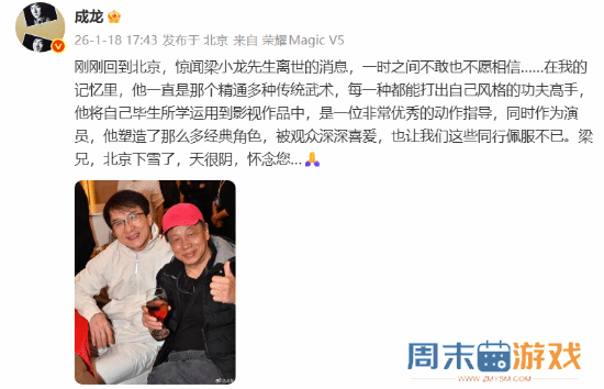 成龙发文悼念梁小龙:北京下雪了天很阴 怀念您今日,著名功夫影星、曾在周星驰电影《功夫》中饰演“火云邪神”而深入人心的梁小龙,于1月14日不幸逝世,享年77岁。下午17:43,成龙在个人社交平台发文缅怀梁小龙。“刚刚回到北京,惊闻梁小龙先生离世的