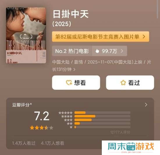 豆瓣开分7.2!辛芷蕾主演《日掛中天》热映中11月8日,由蔡尚君执导,辛芷蕾、张颂文 、冯绍峰领衔主演的《日掛中天》豆瓣开分7 2。37 5%的观众打4分,19 9%的观众打5分,截至目前,豆瓣评分上升为7 3分。电影讲述了困于七年前一桩意外的
