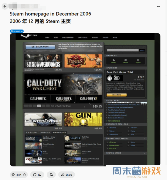 19年前长这样?Reddit网友晒Steam古早截图引热议近日,Reddit 上一篇名为“2006年12月Steam首页”的帖子突然爆火。楼主晒出了一张略微包浆的老截图,引发了无数玩家的共鸣。截至发稿前,贴文已有4800多人点赞,122人参与讨论。图中展示了