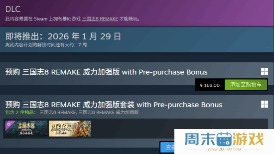 《三国志8重制版 威力加强版》预购开启!国区售价168元《三国志8重制版:威力加强版》今日开启预购!威力加强版价格为168元,威力加强版套装价格为398元,将于2026年1月29日发售。1月28日前购买,可获得预购特典剧本“关羽进军”。2月11日前购买,可