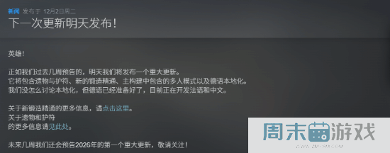 好评ARPG《泰坦之旅2》重磅更新!中文本地化制作中开发商Grimlore Games宣布,《泰坦之旅2》将于明日发布重磅更新,包括遗物和护符、锻造精通、多人联机功能、德语本地化等。另外,官方透露正在制作法语和中文的本地化,之前曾预告中文将于2026年新闻情报 / 2025-12-04 -