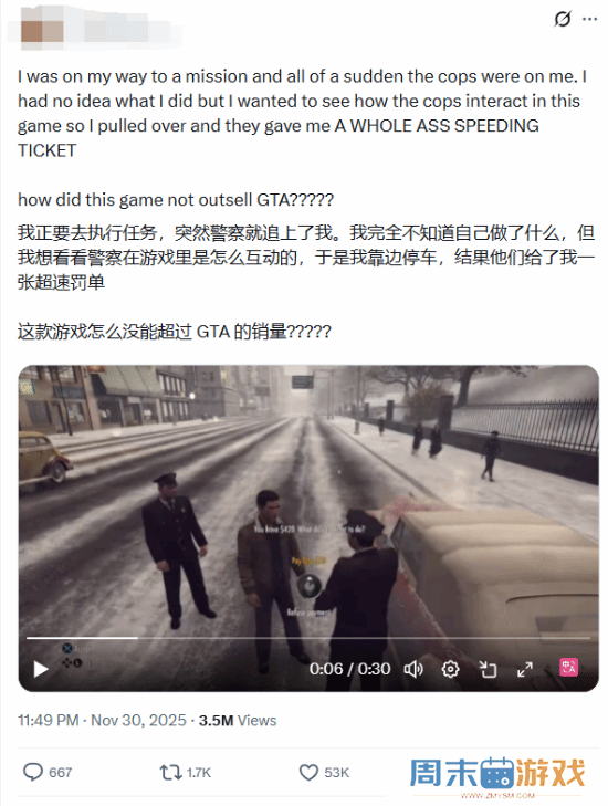 《四海兄弟2》因细节过于真实引外网热议 帖主直言:这质量凭什么卖不过GTA?近日,X上有用户发了一部在《黑手党2》里超速被追缴罚单的视频,引发热议。截至发稿,已有六百多名用户参与了讨论。这份用心的小细节让帖主赞叹不已,忍不住感慨道:“这款游戏怎么没能超过GTA的销量?”,下面新闻情报 / 2025-12-04 -