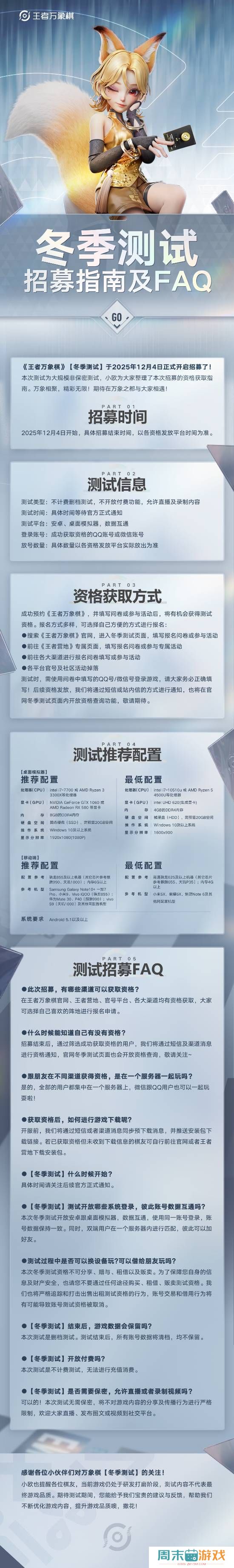《王者荣耀》IP新游《王者万象棋》首次公开测试!大规模非保密《王者荣耀》IP新游《王者万象棋》宣布,首次开放测试【冬季测试】招募开启!本次测试为大规模非保密测试,不删档无付费功能,允许直播及录制内容。测试平台为安卓和桌面模拟器,数据互通。玩家成功预约《王者万象新闻情报 / 2025-12-05 -