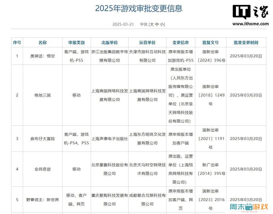 值得关注的是,除了常规的审批信息外,本次公告还特别提到了5款游戏审批信息的变动。其中,《黑神话:悟空》这款备受瞩目的游戏,其审批类别中新增了“游戏机-PS5”,这一消息立即引起了广大玩家的热议。